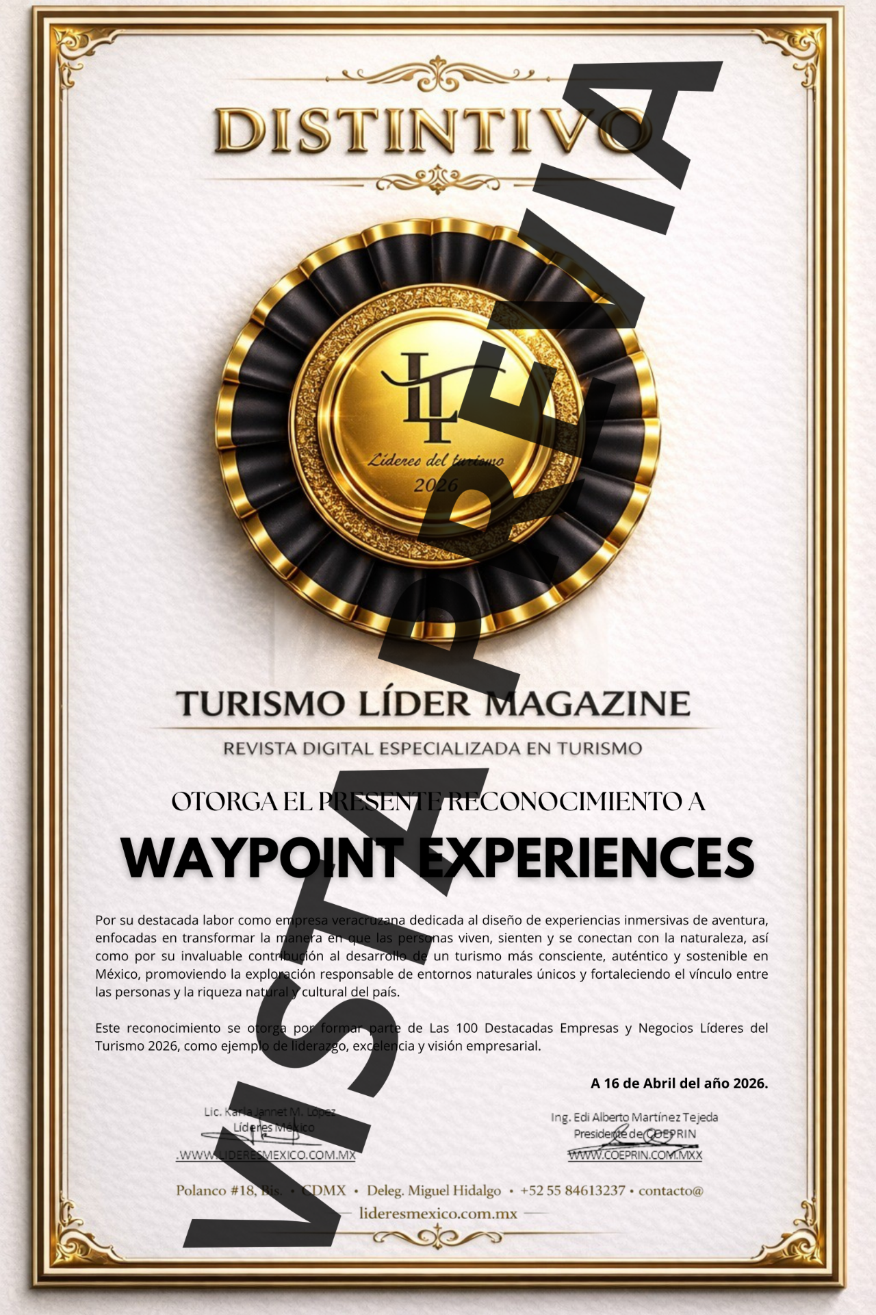 Reciba un cordial saludo y nuestras más sinceras felicitaciones por formar parte de las "100 EMPRESAS Y NEGOCIOS LÍDERES DEL TURISMO EN MÉXICO 2026".