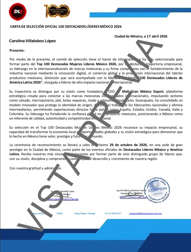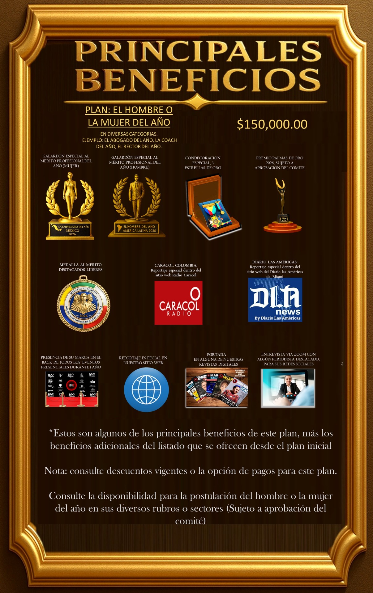 Reciba un cordial saludo y nuestras más sinceras felicitaciones, ya que nuestro comité ha votado en favor de su solicitud para que forme parte de nuestros líderes que próximamente estará recibiendo: "MEDALLA AL MÉRITO DESTACADOS LÍDERES AMÉRICA LATINA 2026 Y EL GALARDÓN AL MÉRITO 100 DESTACADAS MUJERES LÍDERES AMÉRICA LATINA 2026"