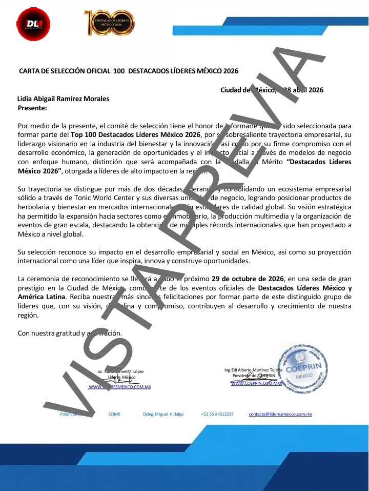 Nuevamente, le reiteramos nuestras más sinceras ¡¡¡FELICITACIONES!!! Por ser parte ya del listado del "100 DESTACADOS LÍDERES MÉXICO Y AMÉRICA LATINA EDICIÓN 2026".