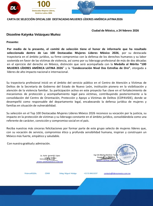 Reciba un cordial saludo y nuestras más sinceras felicitaciones, ya que nuestro comité ha votado en favor de su solicitud para que forme parte de nuestros líderes que el próximo mes de marzo estará recibiendo; "MEDALLA AL MERITO MUJER LÍDER 2026 Y EL GALARDÓN AL MÉRITO 100 DESTACADAS MUJERES LIDERES AMÉRICA LATINA 2026"
