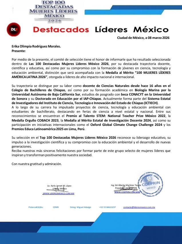 Reciba un cordial saludo y nuestras más sinceras felicitaciones, ya que nuestro comité ha votado a favor de su solicitud para que forme parte de nuestros líderes que el próximo mes de marzo estará recibiendo la "MEDALLA AL MÉRITO MUJER LÍDER 2026", "EL GALARDÓN AL MÉRITO 100 DESTACADAS MUJERES LÍDERES AMÉRICA LATINA 2026"