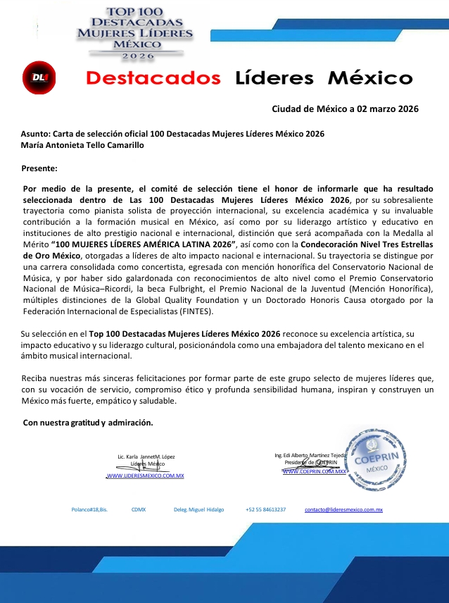 Reciba un cordial saludo y nuestras más sinceras felicitaciones, ya que nuestro comité ha votado a favor de su solicitud para que forme parte de nuestros líderes que el próximo mes de marzo estará recibiendo la "MEDALLA AL MÉRITO MUJER LÍDER 2026", "EL GALARDÓN AL MÉRITO 100 DESTACADAS MUJERES LÍDERES AMÉRICA LATINA 2026" y la "CONDECORACIÓN NIVEL TRES ESTRELLAS DE ORO".