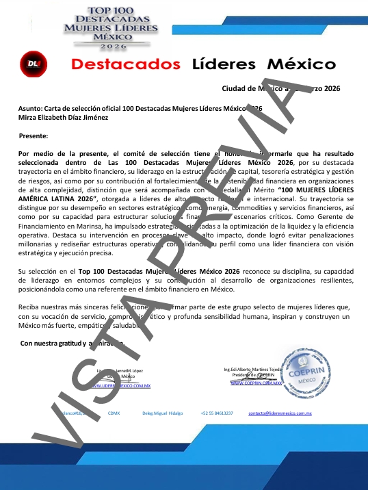 Reciba un cordial saludo y nuestras más sinceras felicitaciones, ya que nuestro comité ha votado a favor de su solicitud para que forme parte de nuestros líderes que el próximo mes de marzo estará recibiendo la "MEDALLA AL MÉRITO MUJER LÍDER 2026", "EL GALARDÓN AL MÉRITO 100 DESTACADAS MUJERES LÍDERES AMÉRICA LATINA 2026"