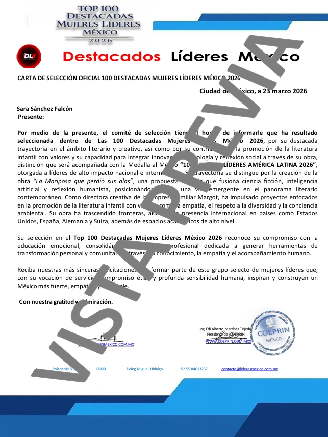 Reciba un cordial saludo y nuestras más sinceras felicitaciones, ya que nuestro comité ha votado a favor de su solicitud para que forme parte de nuestros líderes que el próximo mes de marzo estará recibiendo la "MEDALLA AL MÉRITO MUJER LÍDER 2026", "EL GALARDÓN AL MÉRITO 100 DESTACADAS MUJERES LÍDERES AMÉRICA LATINA 2026"