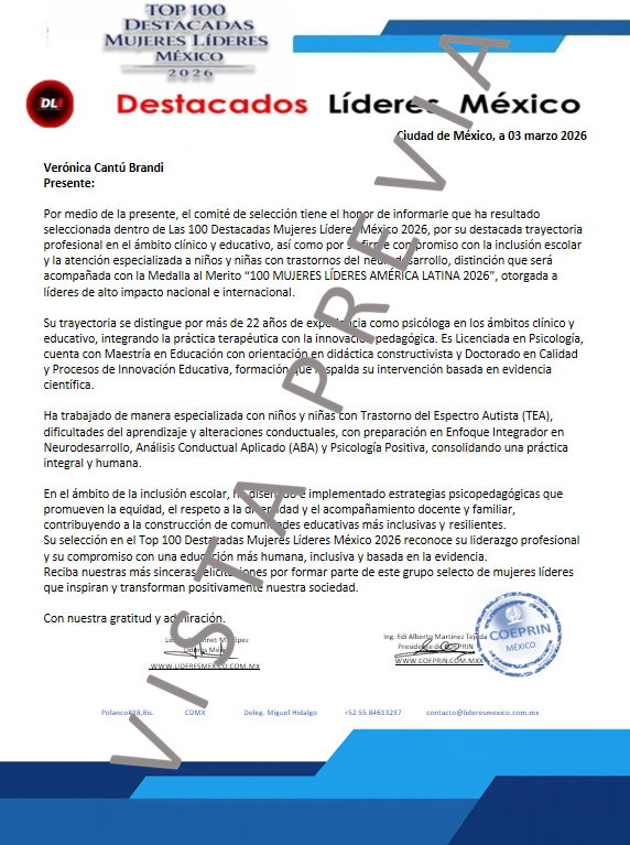 Reciba un cordial saludo y nuestras más sinceras felicitaciones, ya que nuestro comité ha votado a favor de su solicitud para que forme parte de nuestros líderes que el próximo mes de marzo estará recibiendo la "MEDALLA AL MÉRITO MUJER LÍDER 2026", "EL GALARDÓN AL MÉRITO 100 DESTACADAS MUJERES LÍDERES AMÉRICA LATINA 2026" y la "CONDECORACIÓN NIVEL TRES ESTRELLAS DE ORO".