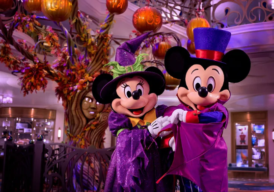 Mickey, Minnie, Donald, Daisy, Goofy y Pluto se disfrazan de brujas, esqueletos o vampiros y posan en zonas fotográficas temáticas, haciendo del barco un escenario viviente de Halloween.