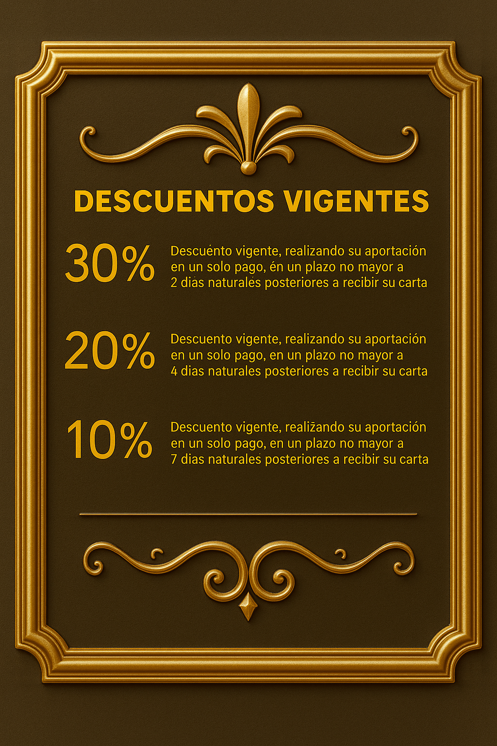 IMPORTANTE ACLARAR QUE LA APORTACIÓN SE DEBE REALIZAR SOLO SI SU POSTULACIÓN ES ACEPTADA POR NUESTRO COMITÉ Y DEBERA LLEVARSE A CABO EN UN PLAZO NO MAYOR A 7 DIAS NATURALES UNA VEZ QUE HAYA RECIBIDO SU CARTA DE ACEPTACIÓN CERTIFICADA. TAL APORTACIÓN PUEDE SER EN PAGOS MENSUALES O EN UN SOLO PAGO CON DESCUENTOS QUE VAN DESDE UN 10% O HASTA UN 30%.