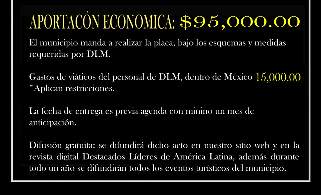 PLAN A) GRATUITO, EL MUNICIPIO SOLO CUBRE LOS VIATICOS DE NUESTRO PERSONAL Y MANDA A REALZIAR LA PLACA DISTINTIVA BAJO LOS ESQUEMAS Y MEDIDAS REQUERIDAS POR DLM.