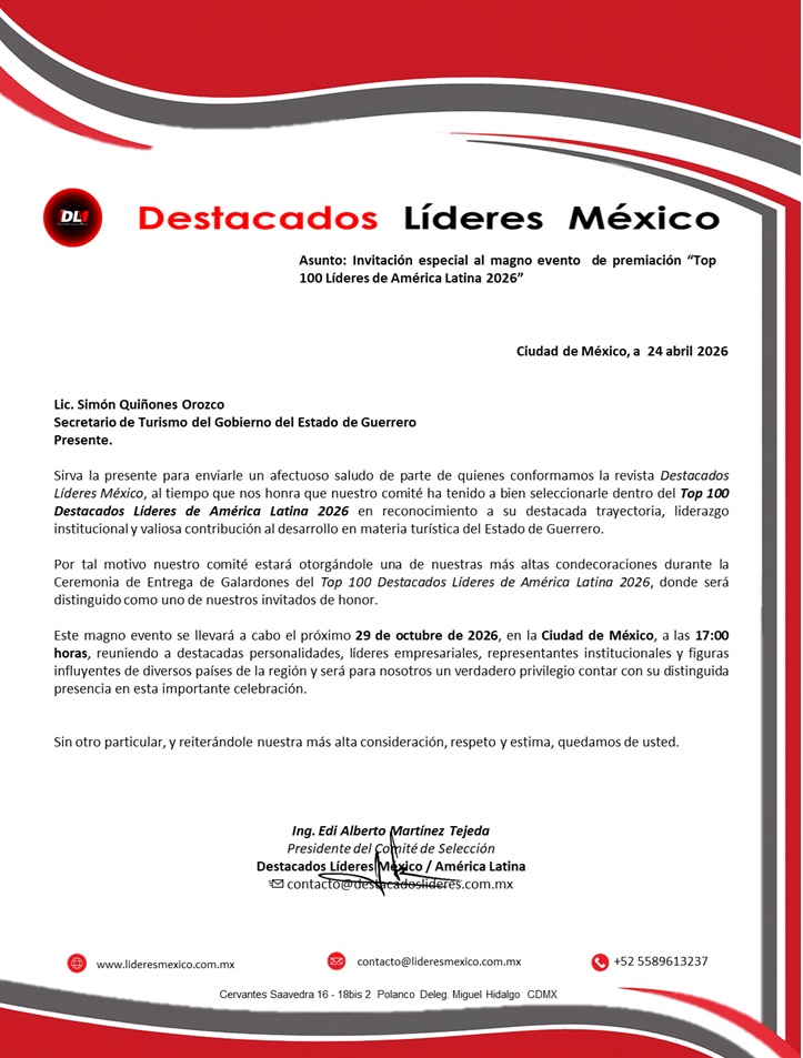 Sirva la presente para enviarle un afectuoso saludo de parte de quienes conformamos la revista Destacados Líderes México, al tiempo que nos honra que nuestro comité ha tenido a bien seleccionarle dentro del Top 100 Destacados Líderes de América Latina 2026 en reconocimiento a su destacada trayectoria, liderazgo institucional y valiosa contribución al desarrollo en materia turística del Estado de Guerrero.