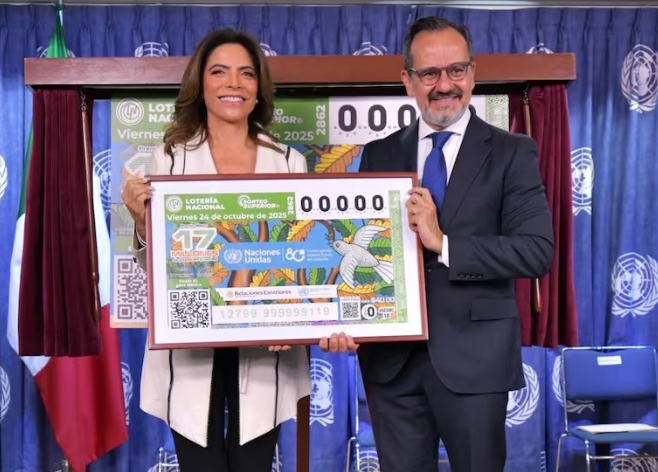 En una emotiva ceremonia celebrada en la sede de las Naciones Unidas en México, este 16 de octubre, se llevó a cabo la develación del billete del Sorteo Superior No. 2862 de la Lotería Nacional, dedicado al 80 aniversario de la Organización de las Naciones Unidas (ONU).