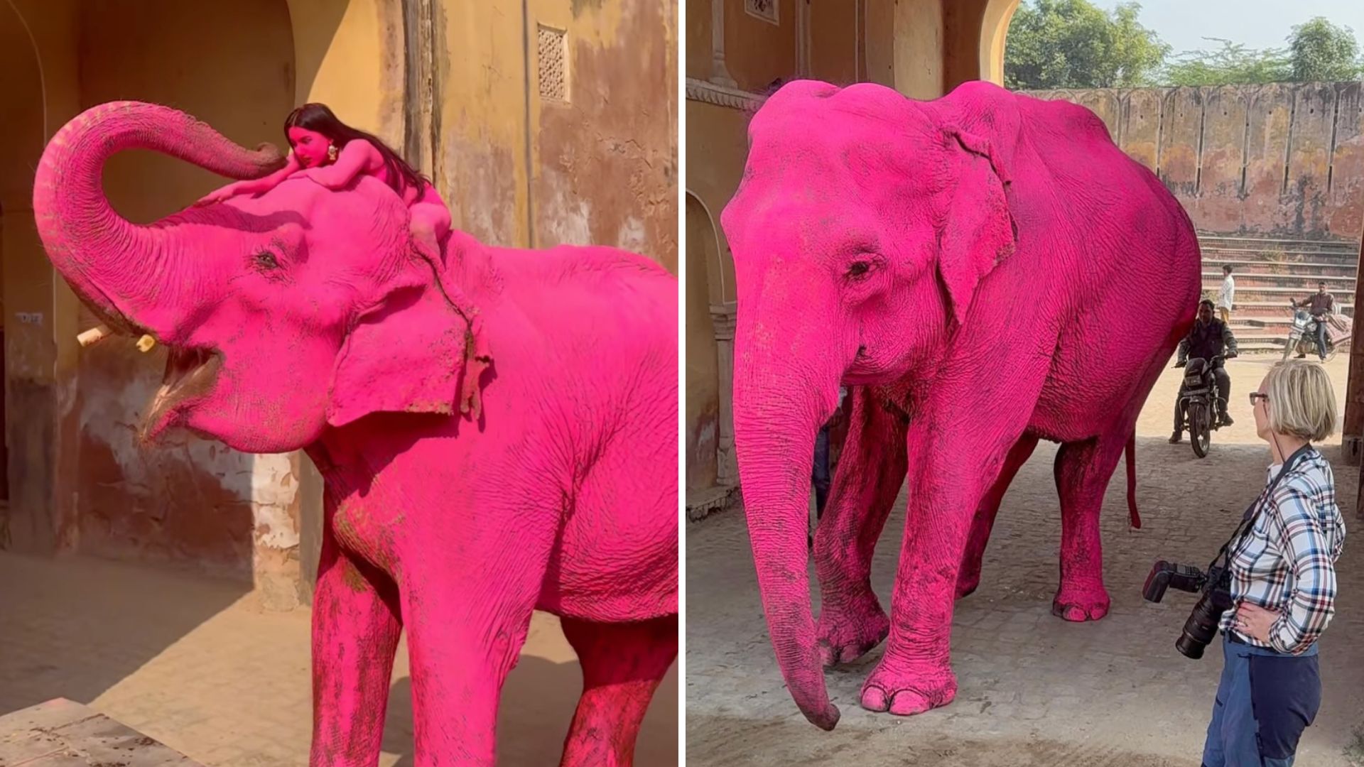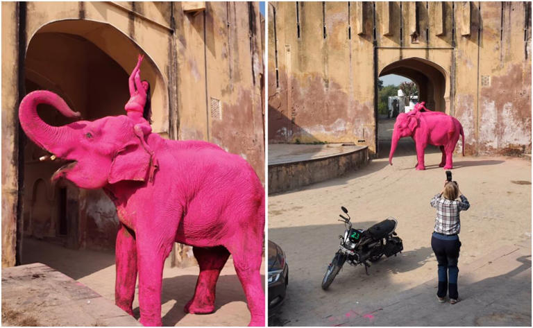 El animal, de aproximadamente 65 años, fue utilizado en una producción artística realizada en Rajastán, India, donde la fotógrafa Julia Buruleva lo cubrió con pintura rosa para crear imágenes de estilo surrealista.