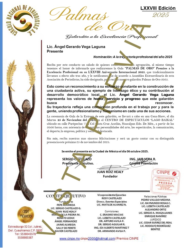 Por medio de este conducto quien suscribe Lic. Kevin Vargas tiene el gran honor de notificarle que su postulación ha resultado aprobado por nuestro comité para recibir el galardón PALMAS DE ORO 2025, este próximo martes 25 de noviembre del 2025 en donde llevaremos a cabo la gran gala de cena -baile en honor a nuestros seleccionados, en donde usted forma parte de ellos.