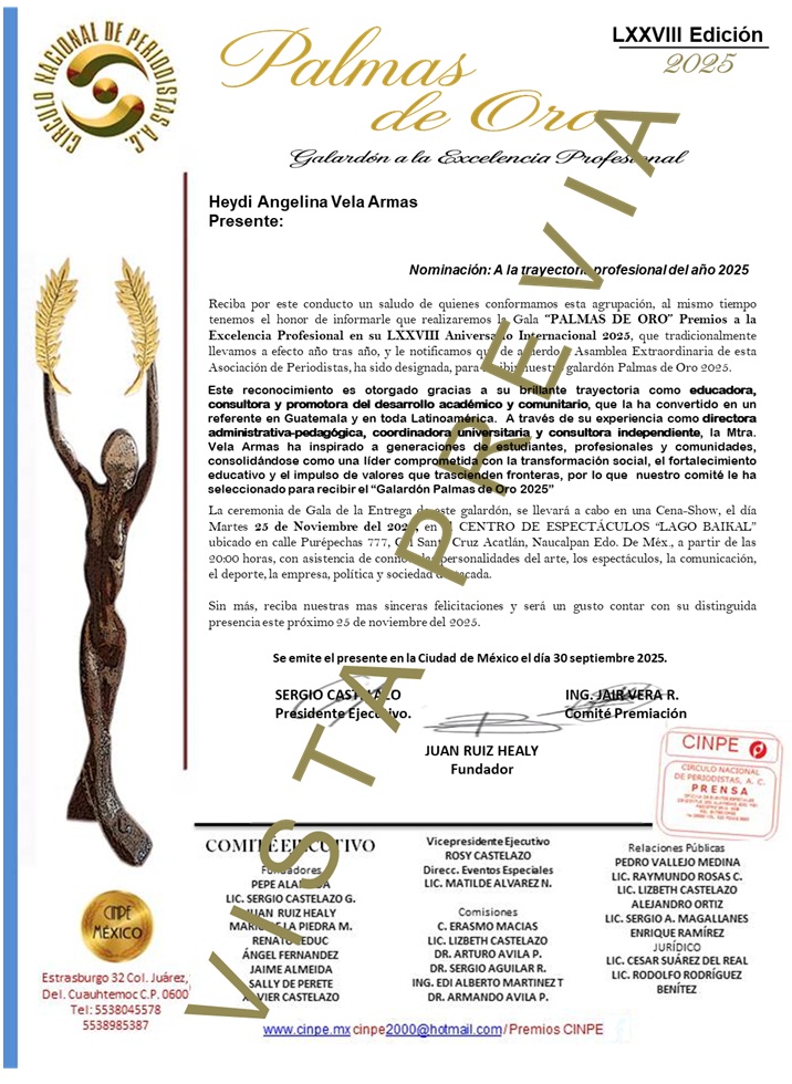 Por medio de este conducto quien suscribe Lic. Kevin Vargas tiene el gran honor de notificarle que su postulación ha resultado aprobado por nuestro comité para recibir el galardón PALMAS DE ORO 2025, este próximo martes 25 de noviembre del 2025 en donde llevaremos a cabo la gran gala de cena -baile en honor a nuestros seleccionados, en donde usted forma parte de ellos.
