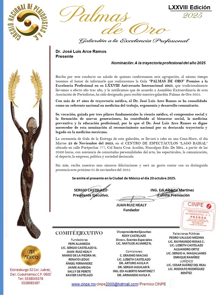 Es importante mencionar que el galardón palmas de oro otorgado por el CINPE, cuenta con más de 40 años de historia reconociendo a quienes día a día se esfuerzan por dejar un legado en nuestra sociedad y en nuestro país. Nuestros galardonados son seleccionados por un jurado conformado por reconocidas personalidades con alta solvencia moral y profesional cuya finalidad es analizar a quienes se postulan y avalar sus exitosas trayectorias o sus inspiradoras historias de éxito.