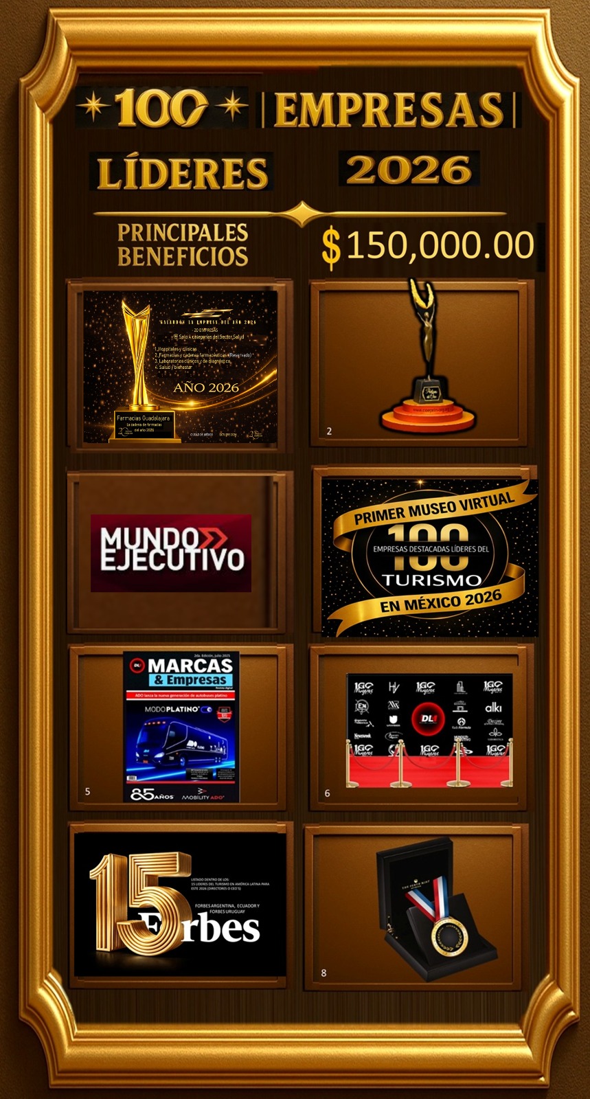 -GALARDÓN DE LUJO EXCLUSIVO LA EMPRESA DEL AÑO, EXCLUSIVO, SOLO UNO POR CATEGORIA A OTORGARSE EL PROXIMO 29 OCTUBRE EN CDMX O SI LO PREFIERE, DENTRO DE SUS INSTALACIONES EN CUALQUIER PARTE DE LA REPUBLICA MEXICANA. (*SE APLICAN RESTRICCIONES, CONSULTE POSIBLES GASTOS EXTRAS DE VIATICOS)