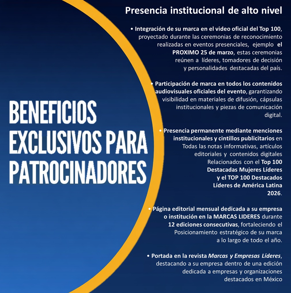 • Presencia permanente mediante menciones institucionales y cintillos publicitarios en todas las notas informativas, artículos editoriales y contenidos digitales relacionados con el Top 100 Destacadas Mujeres Líderes y el TOP 100 Destacados Líderes de América Latina 2026.